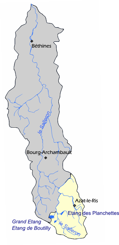 Le Salleron prend sa source à Azat-le-Ris (250 m d’altitude) et s’écoule vers le nord sur plus de 35 km avant de rejoindre l’Anglin, affluent de la Gartempe, dans le département de l’Indre. Sur un bassin versant de 220 km², le SMABGA intervient sur la partie amont, soit 11 km du Salleron jusqu’à la confluence avec le ruisseau des Équilandes, ainsi que 9 km de son affluent rive droite, le ruisseau du Moulin — représentant environ 15 % du bassin.